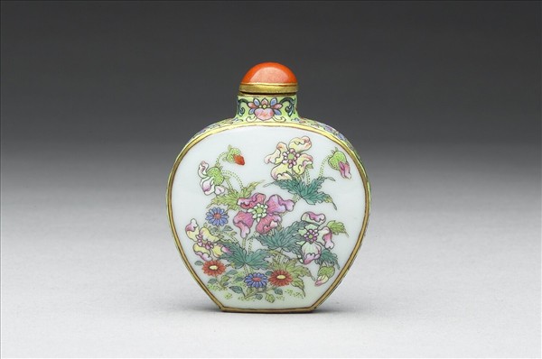 鼻煙壺,小圓口,短頸,扁圓腹下斂,前後微鼓,上厚下薄,平底,附紅色圓頂蓋,下接木塞、牙匙,用來舀壺裡的鼻煙,或盛在小碟上,或直接放在拇指背上,入鼻嗅用。腹前後開光飾白地彩繪四季花卉紋;兩側為草綠地彩繪卷枝花紋;蓋沿、口沿及器緣描金。底外有一行四字篆款「嘉慶年製」。