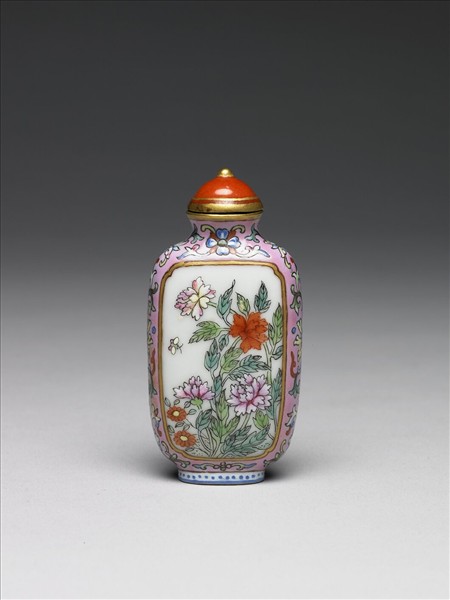 鼻煙壺,口外撇,短頸,扁長腹,前後微鼓,橢圓形圈足,附紅色圓頂蓋,下接木塞、牙匙,用來舀壺裡的鼻煙,或盛在小碟上,或直接放在拇指背上,入鼻嗅用。腹一面開光白地彩繪芍藥、蜂,另面題乾隆御製詩一首;兩側為粉紅地彩繪卷枝花紋。底外有一行四字篆款「乾隆年製」。