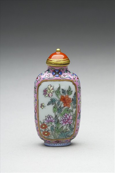 鼻煙壺,口外撇,短頸,扁長腹,前後微鼓,橢圓形圈足,附紅色圓頂蓋,下接木塞、牙匙,用來舀壺裡的鼻煙,或盛在小碟上,或直接放在拇指背上,入鼻嗅用。腹一面開光白地彩繪芍藥、蜂,另面題乾隆御製詩一首;兩側為粉紅地彩繪卷枝花紋。底外有一行四字篆款「乾隆年製」。