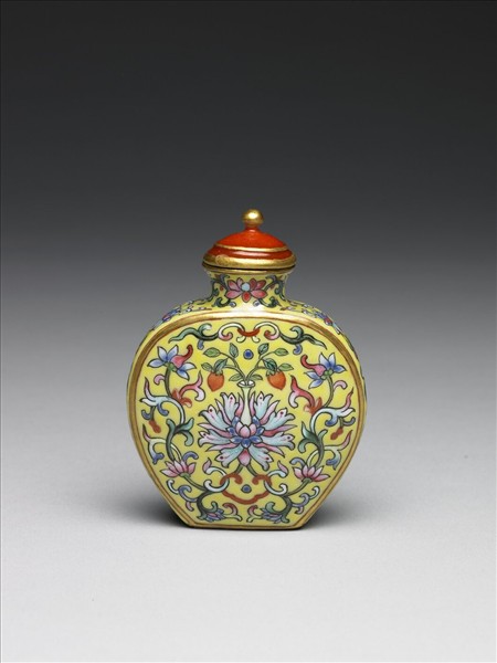 鼻煙壺,口外撇,短頸,扁圓腹下斂,上厚下薄,前後微鼓,平底,附紅色蓋,蓋上突起小鈕,下接木塞、牙匙,用來舀壺裡的鼻煙,或盛在小碟上,或直接放在拇指背上,入鼻嗅用。全器滿佈黃地彩繪卷枝花紋,花心伸出桃實;蓋沿、口沿及器緣均描金邊。底外有一行四字篆款「嘉慶年製」。乾隆、嘉慶年間,常成套燒製釉上彩鼻煙壺,此器為一套十件的其中一件。