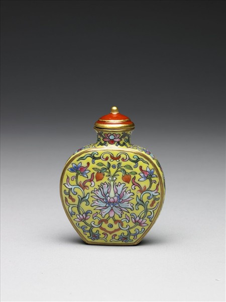鼻煙壺,口外撇,短頸,扁圓腹下斂,上厚下薄,前後微鼓,平底,附紅色蓋,蓋上突起小鈕,下接木塞、牙匙,用來舀壺裡的鼻煙,或盛在小碟上,或直接放在拇指背上,入鼻嗅用。全器滿佈黃地彩繪卷枝花紋,花心伸出桃實;蓋沿、口沿及器緣均描金邊。底外有一行四字篆款「嘉慶年製」。乾隆、嘉慶年間,常成套燒製釉上彩鼻煙壺,此器為一套十件的其中一件。