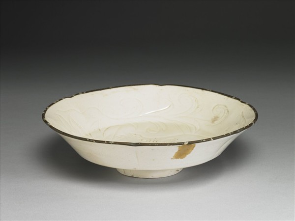 侈口,矮壁,平底,圈足,口與壁作六瓣形,口緣鑲銅邊。通體施白釉,色牙白細潤,盤面模印連枝花卉一株,外壁配合花瓣形劃直稜紋六道。