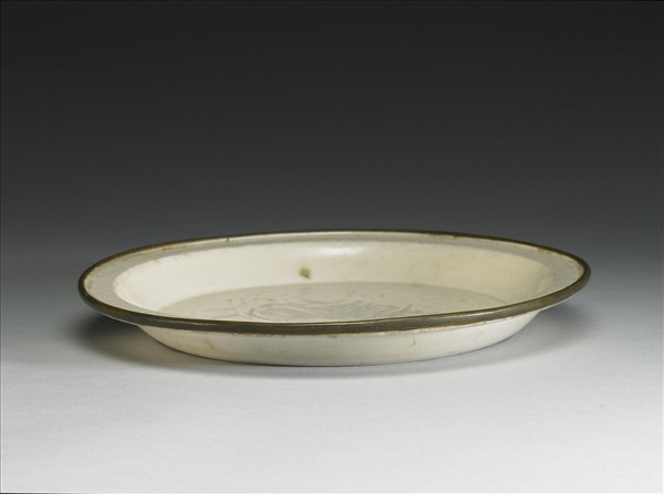 侈口,折唇,矮壁,平底,口緣鑲銅邊。通體施白釉,色牙白細潤,盤面模印卷雲紋,口緣飾回紋一周。