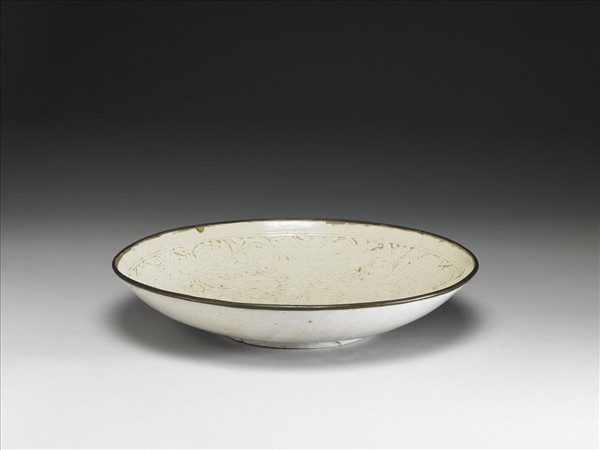 侈口,弧壁,圈足,口緣鑲銅邊。通體施白釉,色牙白細潤,盤心模印雙魚,內壁滿飾荷花與荷葉。
