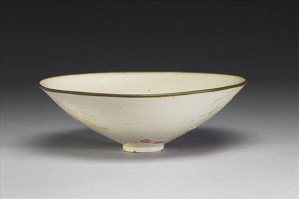 侈口,弧壁,圈足,口緣鑲銅邊。通體施白釉,色牙白細潤,器面刻劃纏枝花卉。