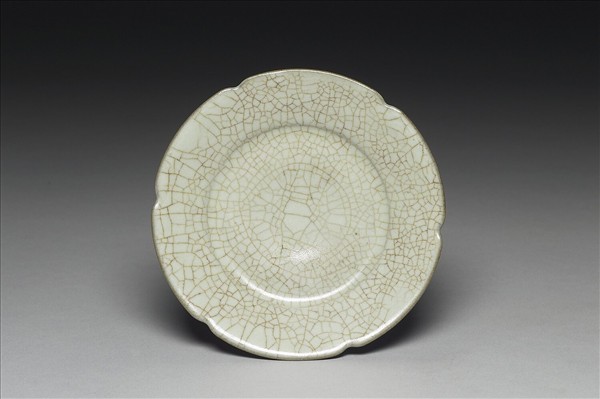 折肩,壁極淺,平底,圈足,器緣作六瓣式葵瓣形。通體施官釉,色淺青灰光潤,釉面滿佈細密的灰棕色開片紋。圈足露胎,塗深棕色汁。