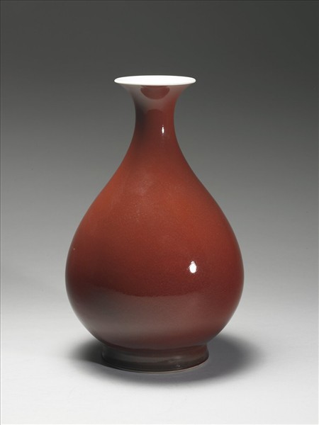 玉壺春式瓶制。外壁罩施霽紅釉,釉色瑩潤光亮。圈足露胎,足內雙圈白地青花書「大清雍正年製」兩行六字楷款。