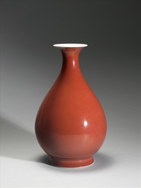 玉壺春式瓶制。外壁罩施霽紅釉,釉色紅豔腴潤。圈足露胎,足內雙圈白地青花書「大清雍正年製」兩行六字楷款。