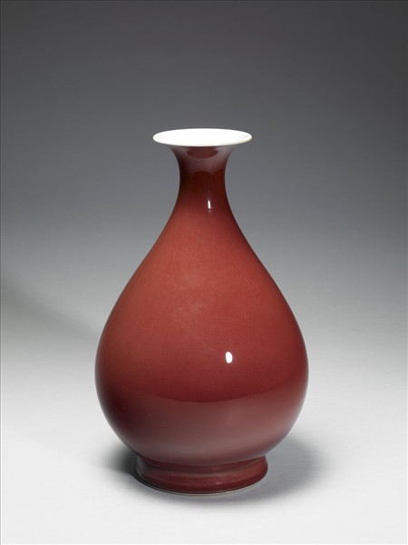 玉壺春式瓶制。外壁罩施霽紅釉,紅釉沉穩瑩亮。圈足露胎,足內雙圈白地青花書「大清雍正年製」兩行六字楷款。