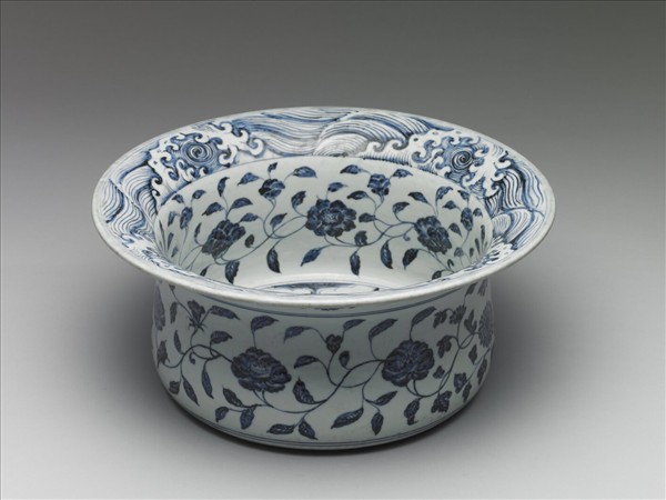 折沿洗敞口、口沿外侈、深壁、壁微內凹、平底無足。全器除器底露胎外,皆以青花為飾。內底心畫六瓣花幾何圖形式花紋,內外壁為纏枝各色花卉,口沿內繪海水波濤紋四組。日本大和文華館藏有一件帶有「大明宣德年製」款識的青花折沿洗,和這件作品的尺寸、紋飾畫風和內底心的六瓣花幾何圖形式花紋都很接近,所以推測其為宣德時期的作品