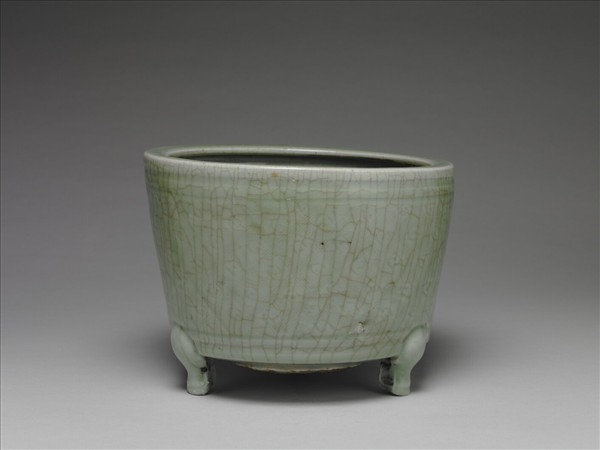 三足爐。圓口,口沿內折,深壁下斂。整器施龍泉窯系青釉,綠釉色淡而灰。口緣與外壁近底處有弦紋數圈。外壁在釉下刻劃斜格紋錦,斜格格框為數道平行細陰線組成,形如刷絲,格內有類雲紋之簡單紋飾。器外底心圓餅狀露胎,胎呈磚紅色。