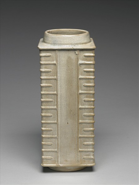 琮式瓶,方形長柱體,上接圓口,下有圈足,器形可以遠溯至良渚文化。整器施乳白釉,並有細碎之鐵線紋。外壁四角各有長短相間的平行凸棱,由上而下排列,亦在模仿琮式瓶上平行凹槽施作所呈現的視覺效果,但工法一外凸一深凹,可說是相當有趣的對比。