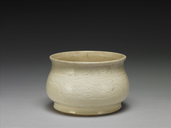 瓷爐,侈口,束頸,碩腹,圈足外撇。外壁施乳白釉,並於釉下刻劃花。腹外壁近頸處凸棱一圈,凸棱上方先以深刻的陰線作波狀紋,在波狀紋分割出的空間中,再用較輕的陰線刻出兩個渦卷,來表現卷草紋。外壁則飾卷枝花葉,花大朵盛開,卷葉舒展佈滿隙地。底外滿釉,後刻「希范堂」三楷字。
