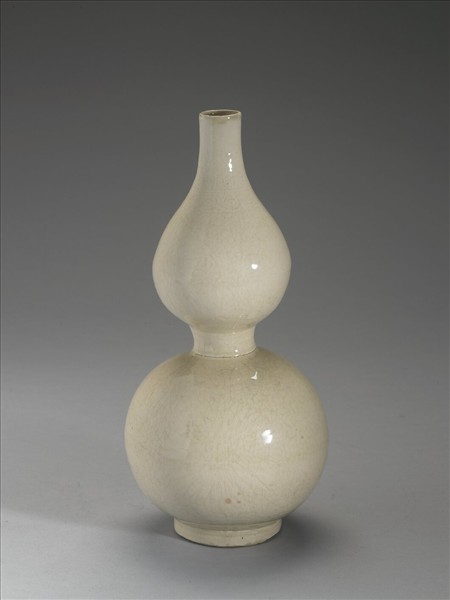 葫蘆形瓷瓶,直口,圈足。整器罩透明釉,色調偏黃。外壁於釉下刻花為飾,口緣下方處回紋、渦卷狀葉紋各一圈,上下兩個向外碩出的器體,則各飾以俯視大朵盛開的花卉,外壁近足處飾渦卷狀葉紋一圈。圈足露胎一圈,足內滿釉無紋飾。