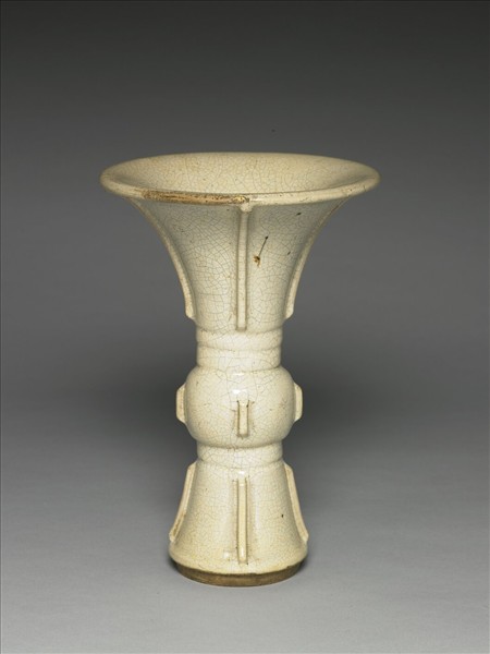 撇口,長頸,鼓腹下端外撇。全器施白色化妝土,頸、腹四面各飾一道出戟,器表釉面滿佈褐色細密開片紋。器底外緣及圈足露胎,呈淺褐色,圈足內器底可見施塗化妝土的痕跡。