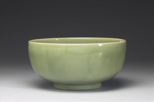 直口大碗,廣口,深腹,垂直的壁面至下腹始收束。全器光素無紋,施青釉,呈冬青色,釉色瑩亮圓潤。足裡環形無釉,墊燒區呈淺褐色。