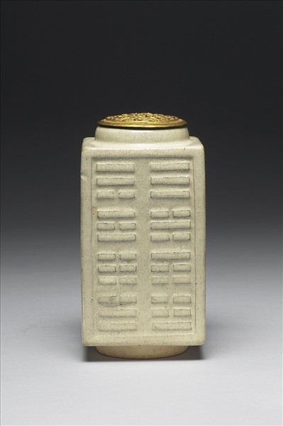 直口,平肩,直長腹,矮圈足。全器施塗白色化妝土,以模印技法製器表紋樣,四面中央凹入,每面各有一組八卦圖紋,四個邊框突起。圈足外側、底緣露胎,呈淺褐色,器底可見施加化妝土的痕跡。附鏤空纏枝花卉紋圓筒形銅膽一只。
