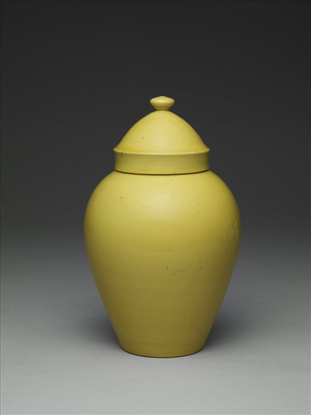 蓋罐,圓口,短直頸,寬肩下斂,淺凹底,帶寶珠鈕笠形蓋。全器光素無紋,罩施黃色釉,釉色勻淨。器外底與蓋內施白釉,蓋底緣露白胎,器身有使用痕。