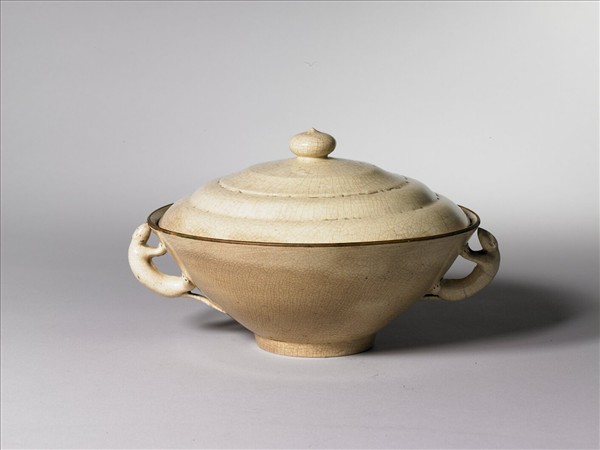 蓋碗,敞口,深壁,圈足,口緣兩側各貼飾一鼠形耳,帶寶珠鈕三階狀笠形蓋。全器施白釉,呈淡米黃色,釉面佈滿細密開片紋,器身採覆燒法,碗口緣及蓋緣露胎無釉,皆鑲銅扣。