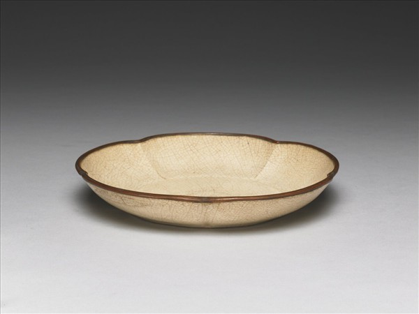 花形碟,敞口,淺壁,平底,口緣做五瓣花形,器壁亦順花口作五棱。全器施白釉,施釉至碟底,呈淡米黃色,釉面佈滿細密開片紋,底部淺施釉,有轆轤旋轉痕,口緣鑲銅扣。