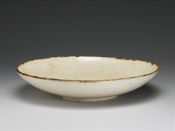 盤,敞口,淺弧壁,圓底,圈足。全器施白釉,呈淡米黃色,內壁模印印花紋飾,盤心為一團壽字,外圍一圈卷枝花卉紋,以回紋框邊;內壁飾轉枝蓮花紋,口沿有兩道弦紋,外壁光素。口緣及圈足底緣露胎無釉,口沿有原嵌銅釦痕。
