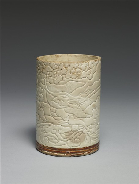 筆筒,直口,直腹,凹足。全器施白釉,呈米黃色,近底外壁施紅褐釉。外壁以刻花為飾,筒身中央盤繞一行龍,隙地飾朵雲紋、靈芝及竹枝,造型活潑,外形線條深刻。底足緣露胎,呈淺褐色。口緣有木扣,今脫落。