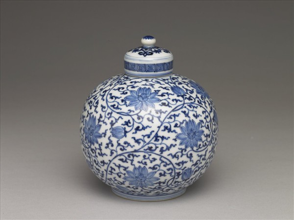 小圓口,短直頸,圓球形器腹,圈足。罩式蓋具寶珠鈕。全器白地青花,外壁滿覆纏枝番蓮花葉,番蓮或盛開、或含苞帶放,其分佈大致可分為上中下三層,每層皆以盛開番蓮與含苞番蓮等距相次橫向排列,隙地則滿布由蓮梗蔓生出來的卷葉。足牆飾弦紋。蓋周壁回紋,蓋面以鈕為中心,周繞花結圖樣,作四瓣柿蒂狀佈置,蓋上青料的發色較深。底足露胎一圈,足內雙圈白地青花書「大清雍正年製」雙行四字楷款。