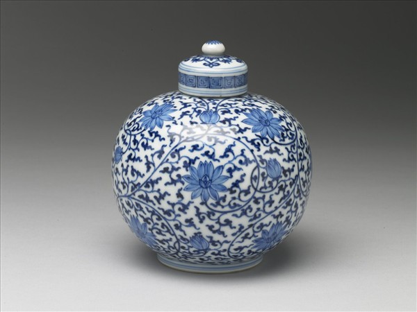 小圓口,短直頸,圓球形器腹,圈足。罩式蓋具寶珠鈕。全器白地青花,外壁滿覆纏枝番蓮花葉,番蓮或盛開、或含苞帶放,其分佈大致可分為上中下三層,每層皆以盛開番蓮與含苞番蓮等距相次橫向排列,隙地則滿布由蓮梗蔓生出來的卷葉。足牆飾弦紋。蓋周壁回紋,蓋面以鈕為中心,周繞花結圖樣,作四瓣柿蒂狀佈置,蓋上青料的發色較深。底足露胎一圈,足內雙圈白地青花書「大清雍正年製」雙行四字楷款。