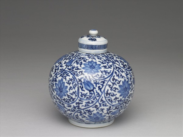 小圓口,短直頸,圓球形器腹,圈足。罩式蓋具寶珠鈕。全器白地青花,外壁滿覆纏枝番蓮花葉,番蓮或盛開、或含苞帶放,其分佈大致可分為上中下三層,每層皆以盛開番蓮與含苞番蓮等距相次橫向排列,隙地則滿布由蓮梗蔓生出來的卷葉。足牆飾弦紋。蓋周壁回紋,蓋面以鈕為中心,周繞花結圖樣,作四瓣柿蒂狀佈置,蓋上青料的發色較深。底足露胎一圈,足內雙圈白地青花書「大清雍正年製」雙行四字楷款。