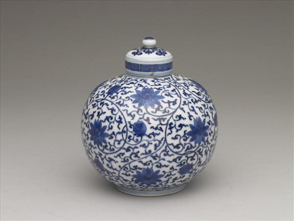 小圓口,短直頸,圓球形器腹,圈足。罩式蓋具寶珠鈕。全器白地青花,外壁滿覆纏枝番蓮花葉,番蓮或盛開、或含苞帶放,其分佈大致可分為上中下三層,每層皆以盛開番蓮與含苞番蓮等距相次橫向排列,隙地則滿布由蓮梗蔓生出來的卷葉。足牆飾弦紋。蓋周壁回紋,蓋面以鈕為中心,周繞花結圖樣,作四瓣柿蒂狀佈置,蓋上青料的發色較深。底足露胎一圈,足內雙圈白地青花書「大清雍正年製」雙行四字楷款。