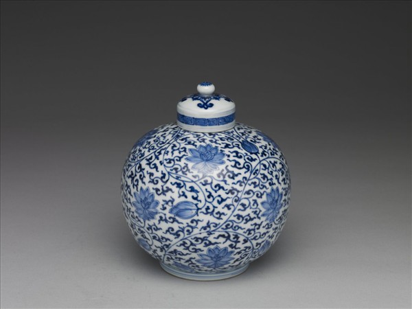 小圓口,短直頸,圓球形器腹,圈足。罩式蓋具寶珠鈕。全器白地青花,外壁滿覆纏枝番蓮花葉,番蓮或盛開、或含苞帶放,其分佈大致可分為上中下三層,每層皆以盛開番蓮與含苞番蓮等距相次橫向排列,隙地則滿布由蓮梗蔓生出來的卷葉。足牆飾弦紋。蓋周壁回紋,蓋面以鈕為中心,周繞花結圖樣,作四瓣柿蒂狀佈置,蓋上青料的發色較深。底足露胎一圈,足內雙圈白地青花書「大清雍正年製」雙行四字楷款。