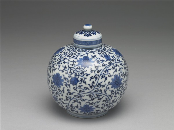 小圓口,短直頸,圓球形器腹,圈足。罩式蓋具寶珠鈕。全器白地青花,外壁滿覆纏枝番蓮花葉,番蓮或盛開、或含苞帶放,其分佈大致可分為上中下三層,每層皆以盛開番蓮與含苞番蓮等距相次橫向排列,隙地則滿布由蓮梗蔓生出來的卷葉。足牆飾弦紋。蓋周壁回紋,蓋面以鈕為中心,周繞花結圖樣,作四瓣柿蒂狀佈置,蓋上青料的發色較深。底足露胎一圈,足內雙圈白地青花書「大清雍正年製」雙行四字楷款。