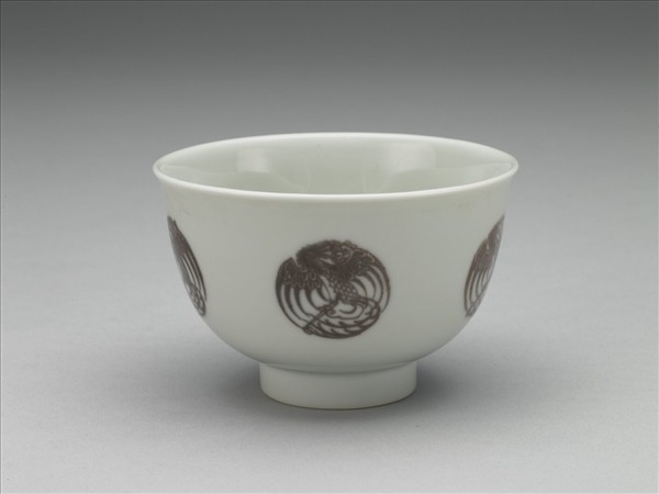 小杯,圓口,唇緣外侈,弧形深壁,平底,矮圈足。胎骨甚薄。外壁裝飾五個紅釉團鳳紋,內底中心亦繪一團鳳紋,鳳首與軀體成S型,雙翅展開於兩側,使整個圖案成圓形,紅釉發色呈灰紅色,帶綠色苔點。外底中心以青花書「大清康熙年製」雙行六字楷款,外加雙圈。