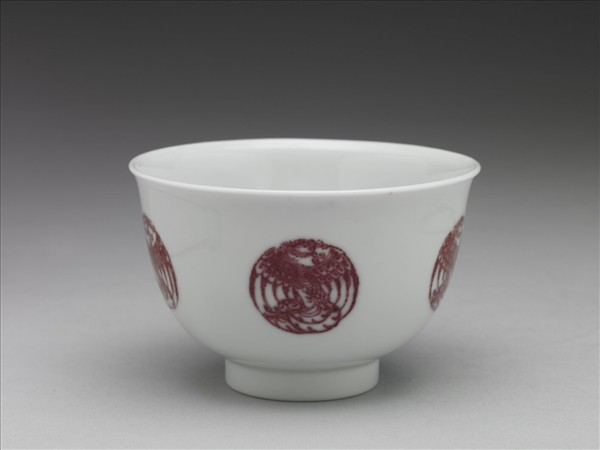 小杯,圓口,唇緣外侈,弧形深壁,平底,矮圈足。胎骨甚薄。外壁裝飾五個紅釉團鳳紋,內底中心亦繪一團鳳紋,鳳首與軀體成S型,雙翅展開於兩側,使整個圖案成圓形,紅釉發色呈紅色,帶綠色苔點。外底中心以青花書「大清康熙年製」雙行六字楷款,外加雙圈。