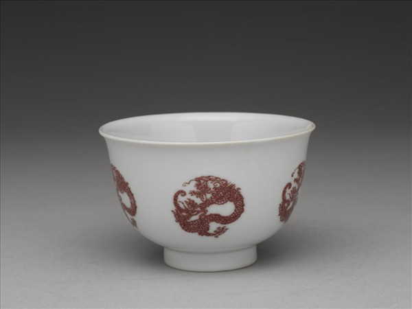 小杯,圓口,唇緣外侈,弧形深壁,平底,矮圈足。胎骨甚薄。外壁裝飾五個紅釉團龍紋,內底中心亦繪一團龍紋,龍盤身張爪成圓形,紅釉發色呈正紅色。外底中心以青花書「大清康熙年製」雙行六字楷款,外加雙圈。