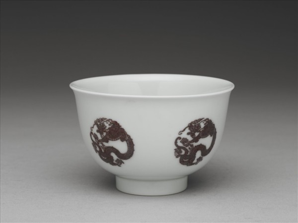 小杯,圓口,唇緣外侈,弧形深壁,平底,矮圈足。胎骨甚薄。外壁裝飾五個紅釉團龍紋,內底中心亦繪一團龍紋,龍盤身張爪成圓形,紅釉發色呈暗紅色近似黑色。外底中心以青花書「大清康熙年製」雙行六字楷款,外加雙圈。