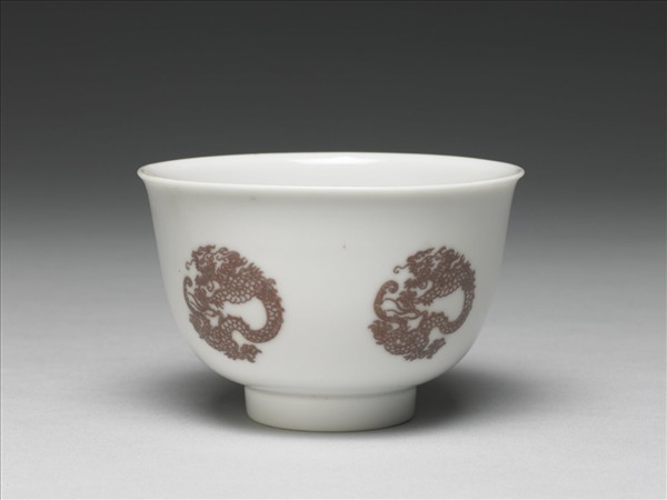 小杯,圓口,唇緣外侈,弧形深壁,平底,矮圈足。胎骨甚薄。外壁裝飾五個紅釉團龍紋,內底中心亦繪一團龍紋,龍盤身張爪成圓形,外壁紅釉發色呈灰紅色,底心則為鮮紅色帶綠色苔點。外底中心以青花書「大清康熙年製」雙行六字楷款,外加雙圈。