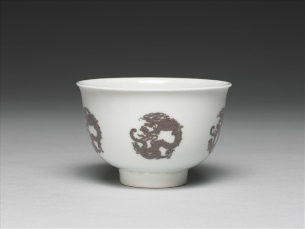 小杯,圓口,唇緣外侈,弧形深壁,平底,矮圈足。胎骨甚薄。外壁裝飾五個紅釉團龍紋,內底中心亦繪一團龍紋,龍盤身張爪成圓形,紅釉發色呈灰黑色。外底中心以青花書「大清康熙年製」雙行六字楷款,外加雙圈。