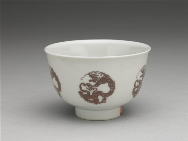 小杯,圓口,唇緣外侈,弧形深壁,平底,矮圈足。胎骨甚薄。外壁裝飾五個紅釉團龍紋,內底中心亦繪一團龍紋,龍盤身張爪成圓形,紅釉發色不均,從紅色至暗紅色都有。外底中心以青花書「大清康熙年製」雙行六字楷款,外加雙圈。