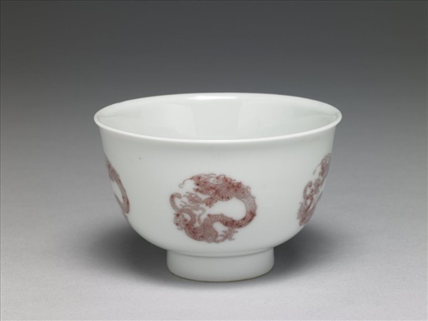 小杯,圓口,唇緣外侈,弧形深壁,平底,矮圈足。胎骨甚薄。外壁裝飾五個紅釉團龍紋,內底中心亦繪一團龍紋,龍盤身張爪成圓形,紅釉發色呈淺紅色,有深色苔點。外底中心以青花書「大清康熙年製」雙行六字楷款,外加雙圈。