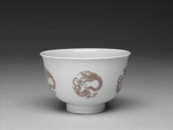 小杯,圓口,唇緣外侈,弧形深壁,平底,矮圈足。胎骨甚薄。外壁裝飾五個紅釉團龍紋,內底中心亦繪一團龍紋,龍盤身張爪成圓形,紅釉發色呈淡淡的灰紅色。外底中心以青花書「大清康熙年製」雙行六字楷款,外加雙圈。