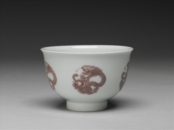 小杯,圓口,唇緣外侈,弧形深壁,平底,矮圈足。胎骨甚薄。外壁裝飾五個紅釉團龍紋,內底中心亦繪一團龍紋,龍盤身張爪成圓形,外壁紅釉發色呈灰紅色,底心則為紅黑色。外底中心以青花書「大清康熙年製」雙行六字楷款,外加雙圈。
