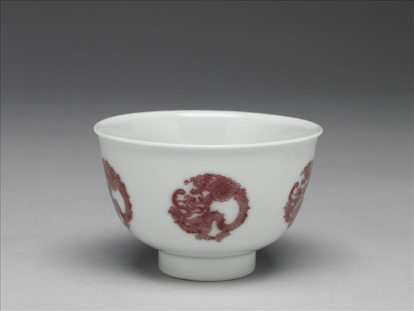小杯,圓口,唇緣外侈,弧形深壁,平底,矮圈足。胎骨甚薄。外壁裝飾五個紅釉團龍紋,內底中心亦繪一團龍紋,龍盤身張爪成圓形,紅釉發色呈鮮紅色,有暗色苔點。外底中心以青花書「大清康熙年製」雙行六字楷款,外加雙圈。