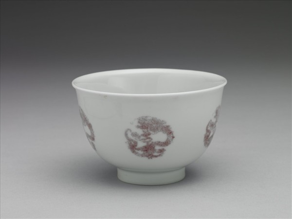小杯,圓口,唇緣外侈,弧形深壁,平底,矮圈足。胎骨甚薄。外壁裝飾五個紅釉團龍紋,內底中心亦繪一團龍紋,龍盤身張爪成圓形,紅釉發色呈灰紅色,圖案略為模糊。外底中心以青花書「大清康熙年製」雙行六字楷款,外加雙圈。