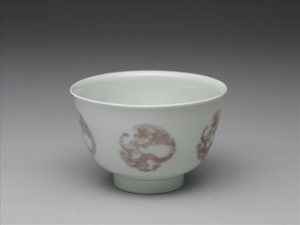 小杯,圓口,唇緣外侈,弧形深壁,平底,矮圈足。胎骨甚薄。外壁裝飾五個紅釉團龍紋,內底中心亦繪一團龍紋,龍盤身張爪成圓形,紅釉發色呈淡紅色,有綠色苔點。外底中心以青花書「大清康熙年製」雙行六字楷款,外加雙圈。