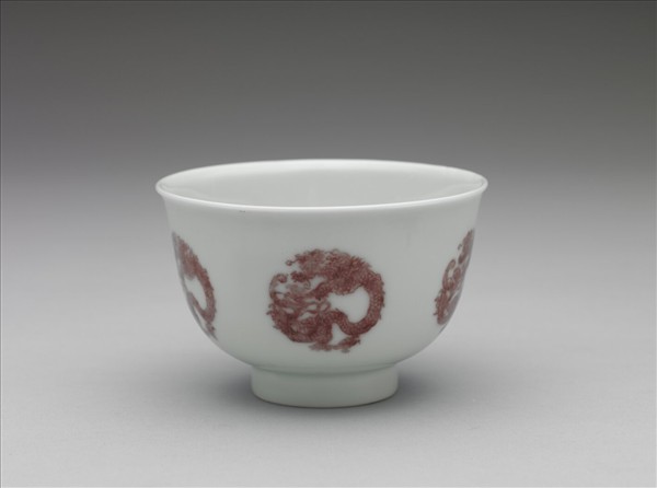 小杯,圓口,唇緣外侈,弧形深壁,平底,矮圈足。胎骨甚薄。外壁裝飾五個紅釉團龍紋,內底中心亦繪一團龍紋,龍盤身張爪成圓形,紅釉發色呈紅色,有綠色苔點。外底中心以青花書「大清康熙年製」雙行六字楷款,外加雙圈。