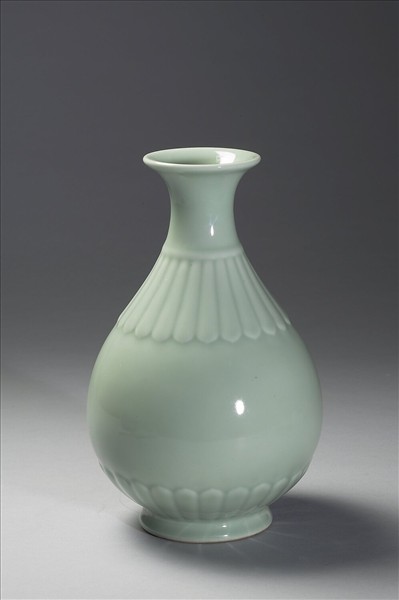 圓口外撇,束頸斜肩,碩腹,撇足。整器罩汝釉,釉色沈靜潤澤。頸肩處覆蓮瓣紋一圈,腹下近足處亦飾蓮瓣紋。圈足露胎,足內汝釉地青花書「大清雍正年製」三行六字篆款。