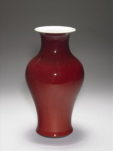 撇口,短頸,豐肩,腹上豐下斂,凹足。器內施白釉,器表施銅紅釉,呈色鮮紅均勻,光潔瑩潤,腹部略有少許灰綠色苔點。圈足露胎,上施棕色護胎汁,底掛白釉,有「大清乾隆年製」陰刻六字三行篆款。