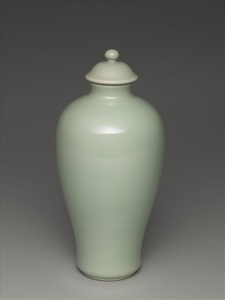 直唇口,短頸,豐肩,腹上豐下斂,近足處一凹棱,平底,淺凹足,帶圓鈕笠形子母口蓋。通體均施青釉,呈冬青色,釉色勻淨淡雅,胎骨勻輕,質堅細膩。底青花書「大清雍正年製」六字雙行雙圓框楷款。雍正時期青釉或青花茶葉罐頗多,可見雍正時期宮廷飲茶風氣之興盛。