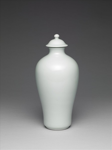 直唇口,短頸,豐肩,腹上豐下斂,近足處一凹棱,平底,淺凹足,帶圓鈕笠形子母口蓋。通體均施青釉,呈粉青色,釉色勻淨淡雅,胎骨勻輕,質堅細膩。底青花書「大清雍正年製」六字雙行雙圓框楷款。雍正時期青釉或青花茶葉罐頗多,可見雍正時期宮廷飲茶風氣之興盛。